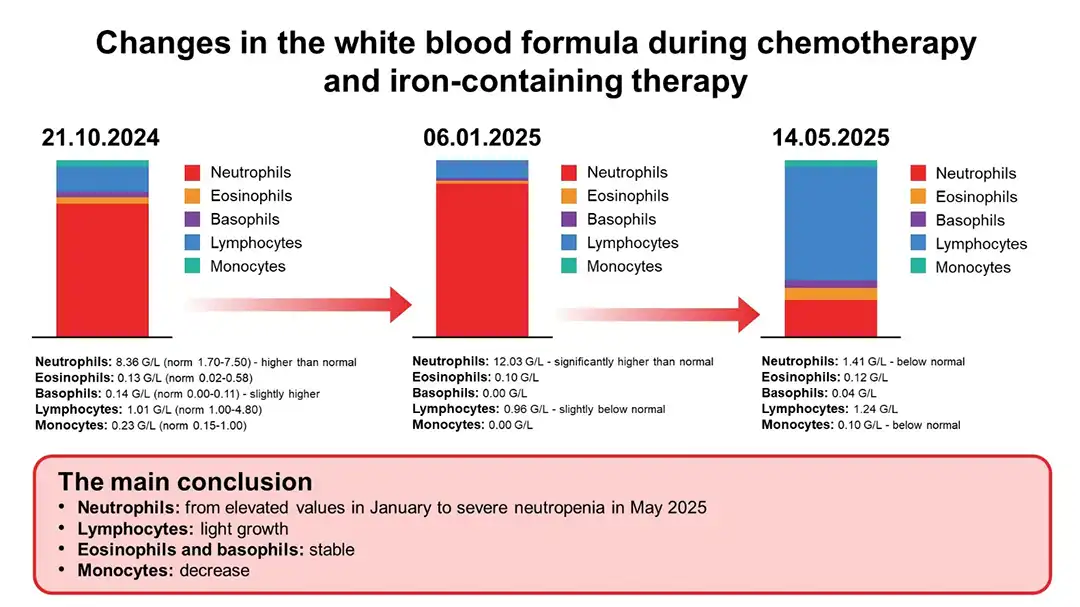 In the figure, this can be seen as a sharp "drop" in the neutrophil line by May 2025.
