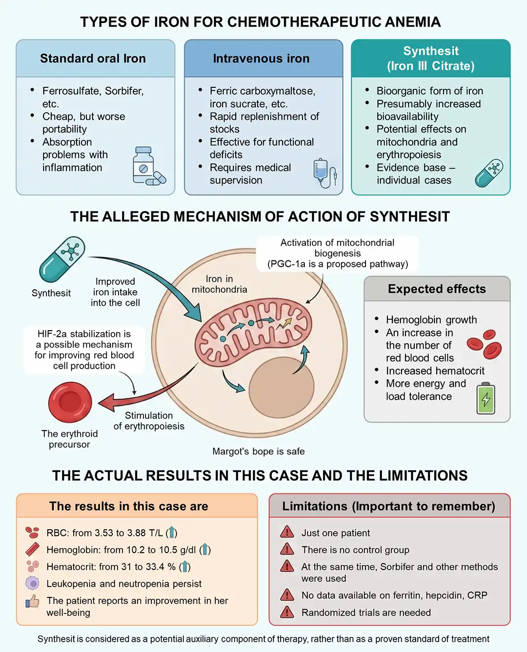 The scientific article we are reviewing describes a rather rare situation - an attempt to support a patient's blood during severe chemotherapy with iron supplementation Synthesit (a proprietary form of iron in the form of ferricitrate) in a woman with stage III oral cancer.
