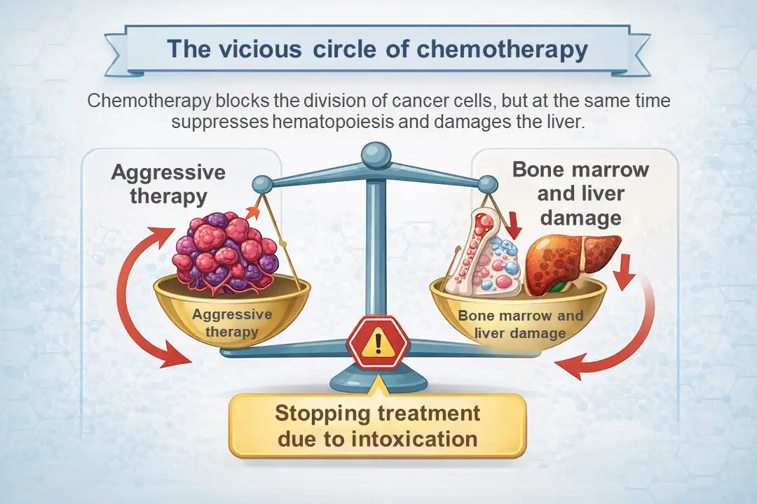 These drugs effectively block the division of cancer cells, but they are not selective. Bone marrow cells responsible for hematopoiesis and liver cells are affected. As a result, patients develop myelosuppression, a condition in which the level of hemoglobin, white blood cells, and platelets drops to critical levels. To this is added hepatotoxicity — damage to the liver, which cannot cope with the processing of toxins. In such conditions, doctors are often forced to interrupt treatment, which gives the tumor a chance to grow again.