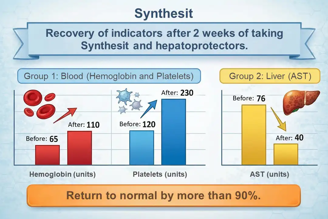The doctors decided to temporarily suspend the main treatment and start intensive maintenance therapy. In addition to the standard hepatoprotectors and iron preparations, Synthesit was prescribed to the patient.